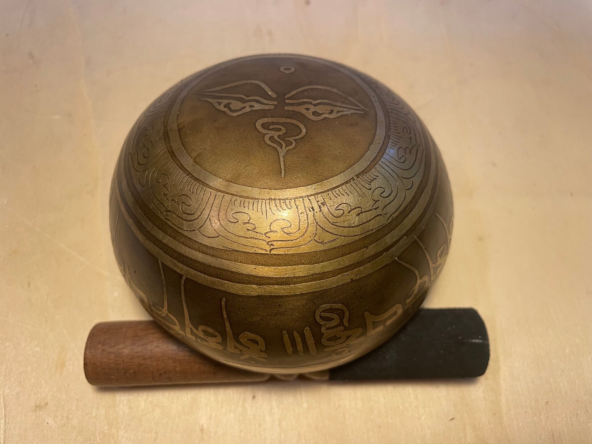 Tibetische Klangschale mit Mantra-Gravur und buddhistischen Symbolen, Om Ma Ni Pe Me Hung, Buddhas Auge